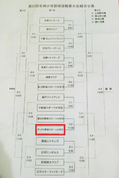 3/5(土)に行われる名崎少年野球団親善大会の対戦表をアップします。